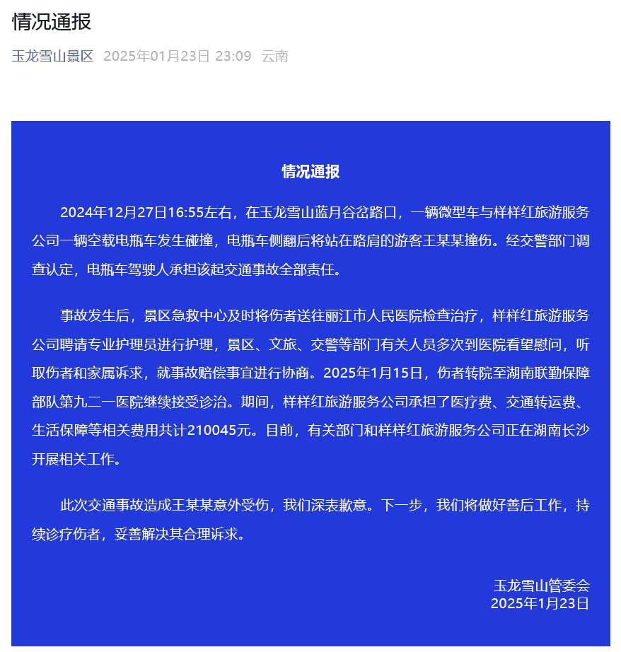 据九派新闻,针对媒体报道“老人被景区观光车撞倒受伤”一事,1月23日晚,玉龙雪山景区发布情况通报: