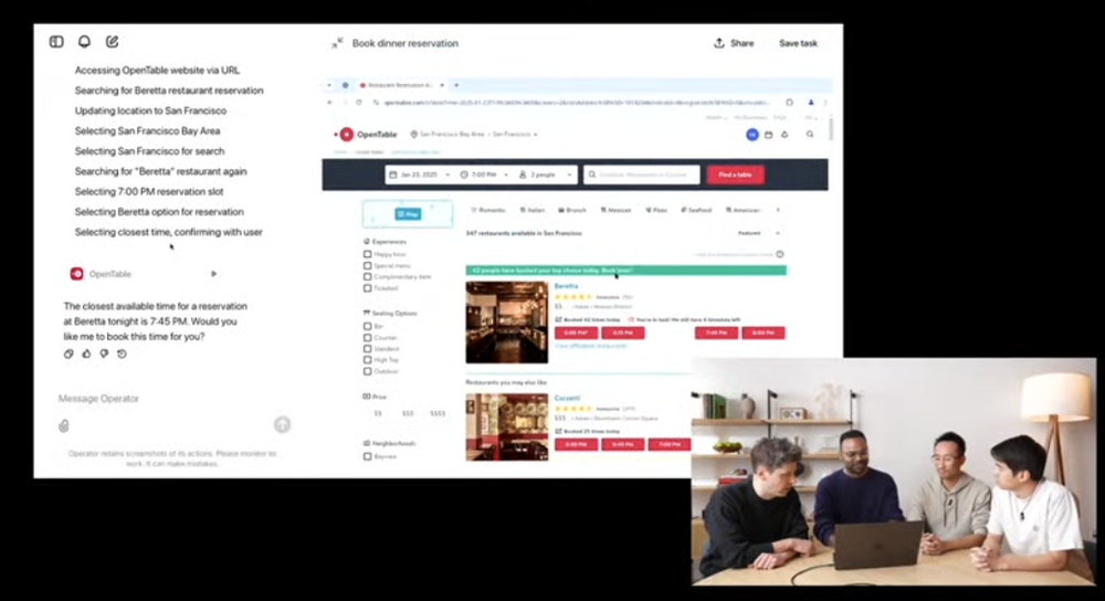在OpenAI通往通用人工智能(AGI)的五个步骤中,AI代理是继聊天机器人、推理机器人之后的第三步,也是全新的一步。Operator的界面与聊天机器人ChatGPT类似,最大的区别是调用“AI代理”完成用户吩咐的事情。在演示案例中,Operator被要求预订某家饭店。用户只需要在对话框中输入“给我订一个XX饭店今晚19点的桌子”,然后AI代理就会自己打开网页,进入预订网站,搜索餐厅并完成预订。如果用户所需的时段已经被订完,AI会询问“19点的桌子订完了,19点45分的桌子还有,要不要订?”
