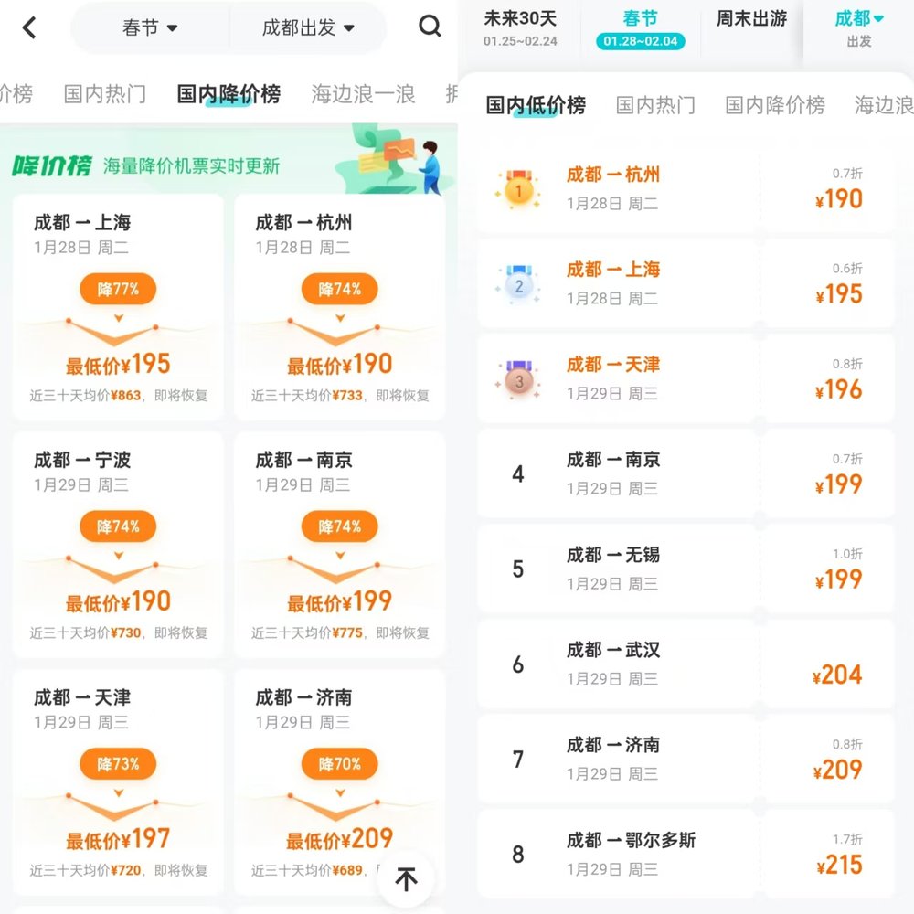 以成都出发的机票为例,春节假期期间,成都到上海降价77%、到济南降价70%、到杭州降价74%。在低价机票方面,春节假期期间,成都飞往杭州、南京、武汉、无锡、天津、上海等城市均只需200元左右。