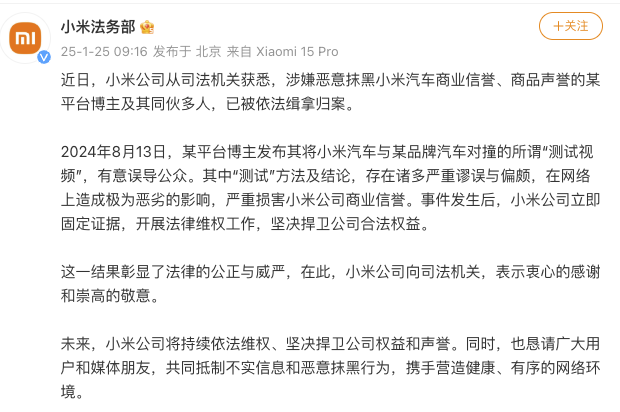 据界面新闻,1月25日,小米法务部官博发文称,近日,小米公司从司法机关获悉,涉嫌恶意抹黑小米汽车商业信誉、商品声誉的某平台博主及其同伙多人,已被依法缉拿归案。2024年8月13日,某平台博主发布其将小米汽车与某品牌汽车对撞的所谓“测试视频”,有意误导公众。其中“测试”方法及结论,存在诸多严重谬误与偏颇,在网络上造成极为恶劣的影响,严重损害小米公司商业信誉。事件发生后,小米公司立即固定证据,开展法律维权工作,坚决捍卫公司合法权益。