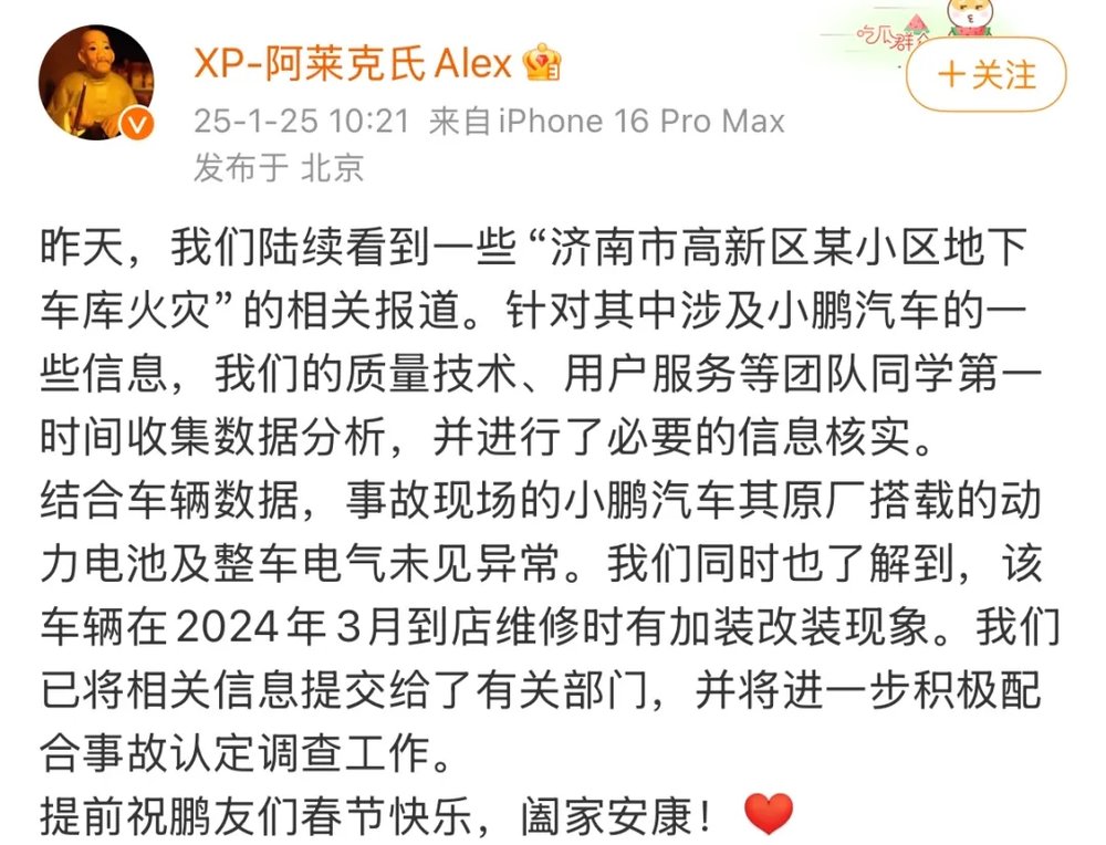 据第一财经,1月25日,小鹏汽车公关负责人@XP-阿莱克氏Alex 在微博发文回应“小鹏汽车起火烧毁地库十几辆车”一事。