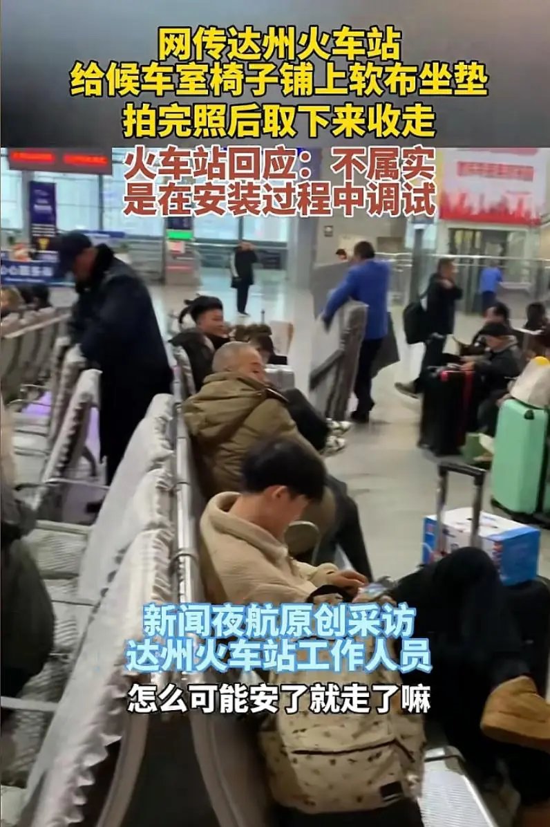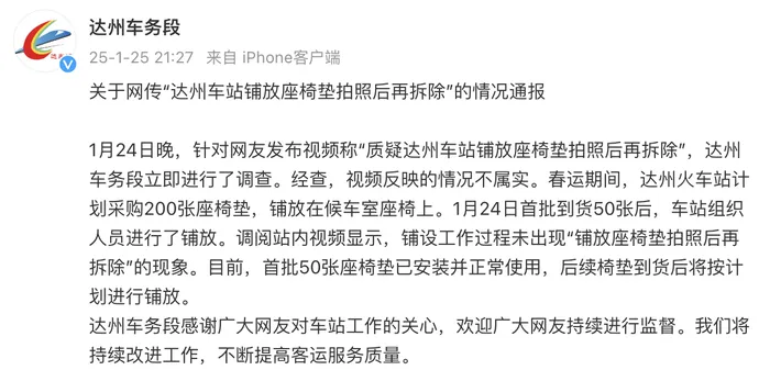 1月24日晚,针对网友发布视频称“质疑达州车站铺放座椅垫拍照后再拆除”,达州车务段立即进行了调查。经查,视频反映的情况不属实。春运期间,达州火车站计划采购200张座椅垫,铺放在候车室座椅上。1月24日首批到货50张后,车站组织人员进行了铺放。调阅站内视频显示,铺设工作过程未出现“铺放座椅垫拍照后再拆除”的现象。目前,首批50张座椅垫已安装并正常使用,后续椅垫到货后将按计划进行铺放。