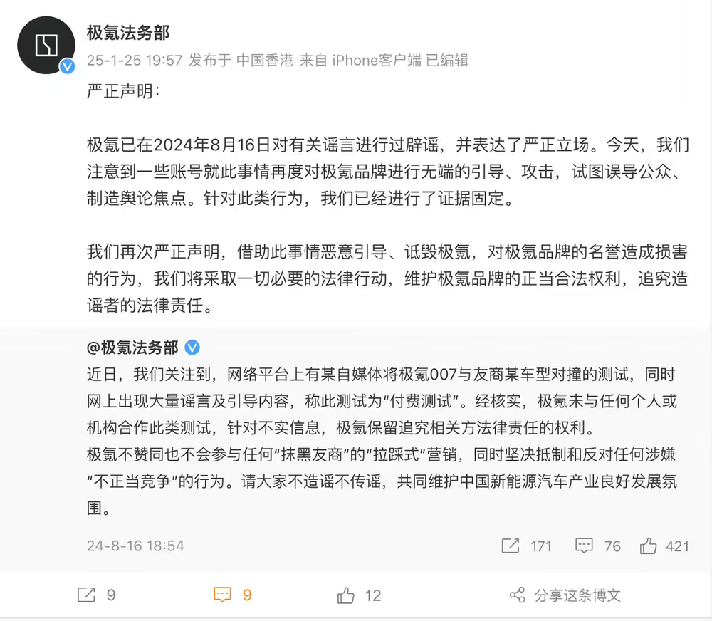 极氪法务部表示:“我们再次严正声明,借助此事情恶意引导、诋毁极氪,对极氪品牌的名誉造成损害的行为,我们将采取一切必要的法律行动,维护极氪品牌的正当合法权利,追究造谣者的法律责任。”