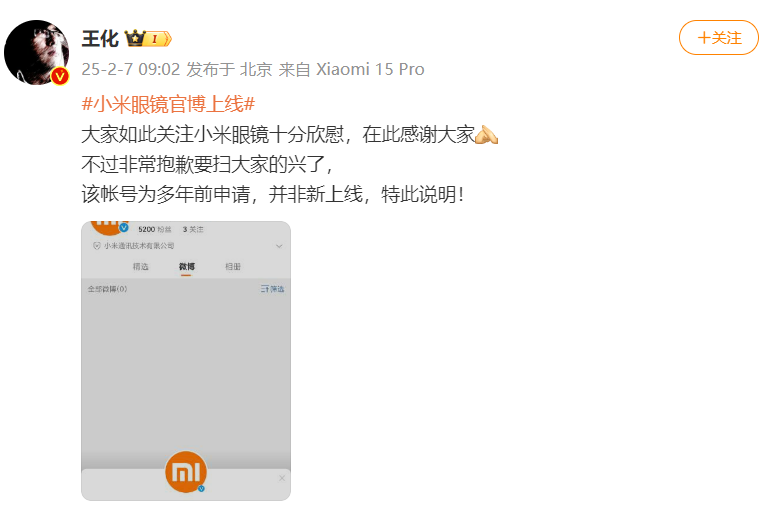 【小米集团公关部总经理王化回应“小米眼镜官博上线”:帐号为多年前申请,并非新上线】