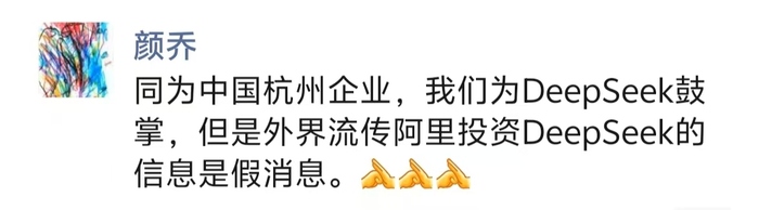 据界面新闻,有传言称阿里拟10亿美元投资DeepSeek。阿里巴巴集团副总裁颜乔2月7日在朋友圈对此表示:“同为中国杭州企业,我们为DeepSeek鼓掌,但是外界流传阿里投资DeepSeek的信息是假消息。”