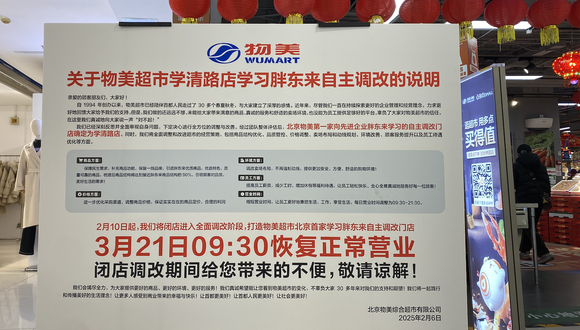 据界面新闻,2月6日,物美集团发布《关于物美学清路店学习胖东来自主调改的说明》公告,北京物美第一家向胖东来学习的自主调改门店确定为学清路店,该店将于2月10日起闭店调改,并将于3月21日上午9点半恢复正常营业。