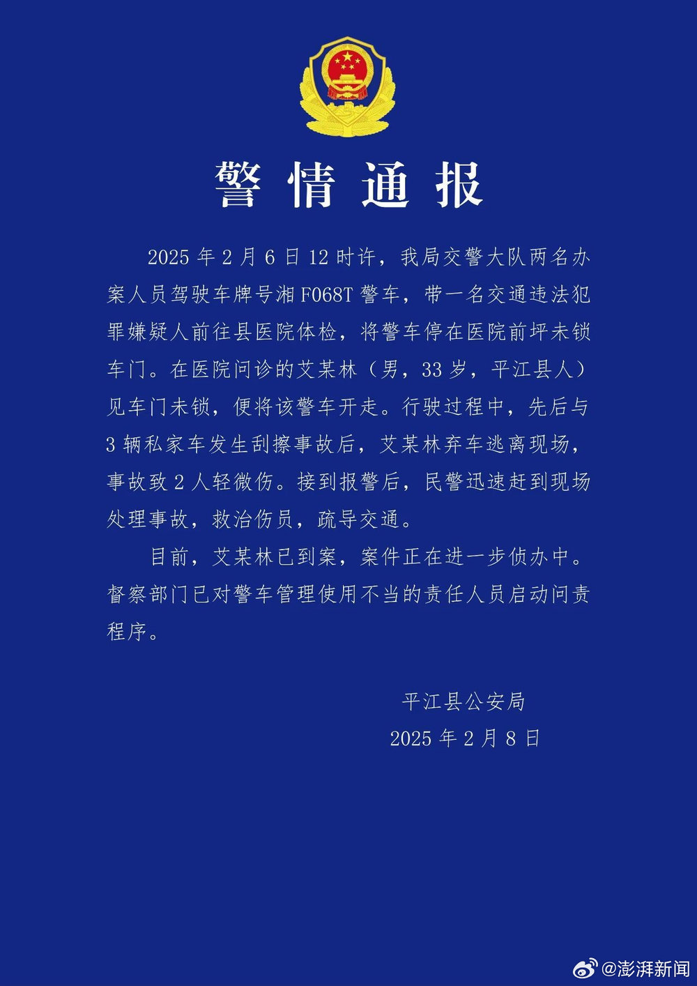 据澎湃新闻,近日,网传湖南一警车连撞3车后驾驶员逃逸。2月8日,平江县公安局发布通报称:2月6日12时许,该局交警大队两名办案人员驾驶车牌号湘F068T警车,带一名交通违法犯罪嫌疑人前往县医院体检,将警车停在医院前坪未锁车门。在医院问诊的艾某林(男,31岁,平江县人)见车门未锁,便将该警车开走。行驶过程中,先后与3辆私家车发生刮擦事故后,艾某林弃车逃离现场,事故致2人轻微伤。接到报警后,民警迅速赶到现场处理事故,救治伤员,疏导交通。目前,艾某林已到案,案件正在进一步侦办中。督察部门已对警车管理使用不当的责任人员启动问责程序。