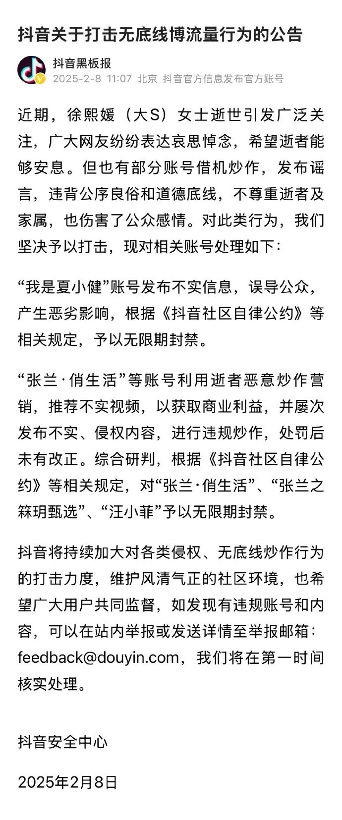 据界面新闻,抖音安全中心2月8日公告称,近期,徐熙媛(大S)女士逝世引发广泛关注,广大网友纷纷表达哀思悼念,希望逝者能够安息。但也有部分账号借机炒作,发布谣言,违背公序良俗和道德底线,不尊重逝者及家属,也伤害了公众感情。对此类行为,我们坚决予以打击,现对相关账号处理如下: