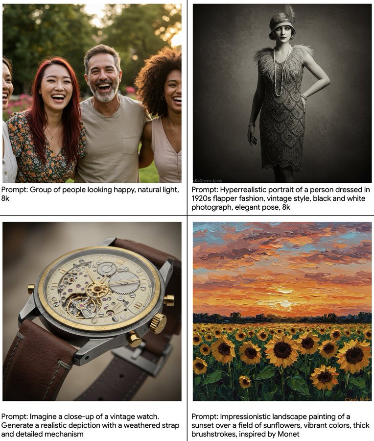 开发者可以通过Gemini API使用 成本为0.03美元/张除了图像生成的数量(例如生成1张、3张或更多),开发者还可以调整图像的纵横比等参数,从而在生成图像时提供更多的定制化选项。Imagen 3 是 Google 推出的最新图像生成模型,它能够根据用户输入的文本提示(prompt)生成各种类型的高质量图像。 这些图像可以是超现实主义的风景,印象派的画作,抽象艺术,甚至是动漫风格的角色。该模型在生成的图像上几乎没有瑕疵,色彩和细节都处理得非常精细,适用于多种创意工作,包括艺术创作、广告设计、游戏开发等。