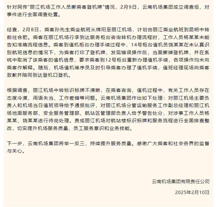 据央视网,2月10日,云南机场集团有限责任公司发布关于网传“丽江机场工作人员撕乘客登机牌”的调查处理通报。
