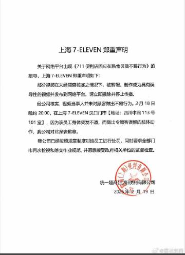 据中国新闻周刊,2月19日,711便利店发文回应:关于网络平台出现《711 便利店回应在熟食区做不雅行为》的报导,上海 7-ELEVEN 郑重声明如下:部分视频在未经调查核实之情况下,被剪辑、制作成为具有误导性的视频并发布到网络平台。请立即撤除并停止传播。
