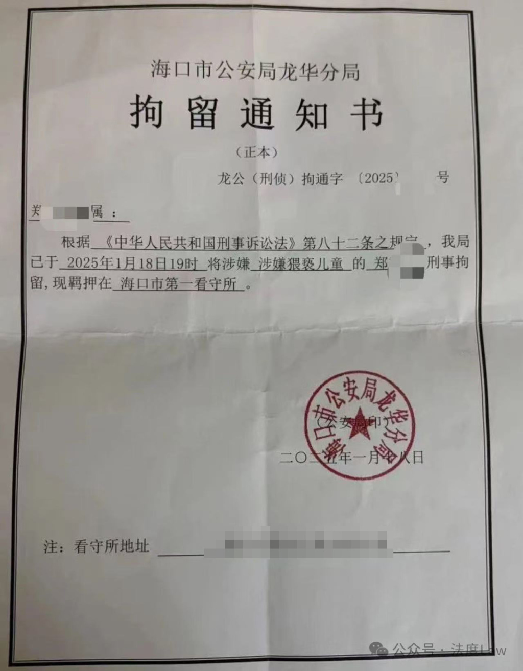 澎湃新闻获得的《拘留通知书》显示,郑某某名为郑某峰,由海口市公安局龙华分局于今年1月18日签发,郑某峰因涉嫌猥亵儿童于当日19时被刑事拘留,其被羁押在海口市第一看守所。权威人士告诉澎湃新闻,该《拘留通知书》是真实的。
