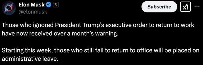 据界面新闻,美国政府效率部负责人马斯克2月24日在社交媒体发文称,那些无视总统特朗普复工令的人现在已经收到了一个多月的警告。从本周开始,那些仍未返回办公室的政府员工将被安排行政休假。