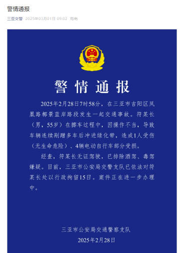 据红星新闻,三亚市公安局交通警察支队3月1日早上发布警情通报:2025年2月28日7时58分,在三亚市吉阳区凤凰路椰景蓝岸路段发生一起交通事故。符某长(男,55岁)在挪车过程中,因操作不当,导致车辆连续剐蹭多车后冲进绿化带,造成1人受伤(无生命危险)、4辆电动自行车部分受损。经查,符某长无证驾驶,已排除酒驾、毒驾嫌疑。目前,三亚市公安局交警支队已依法对符某长处以行政拘留15日。案件正在进一步办理中。