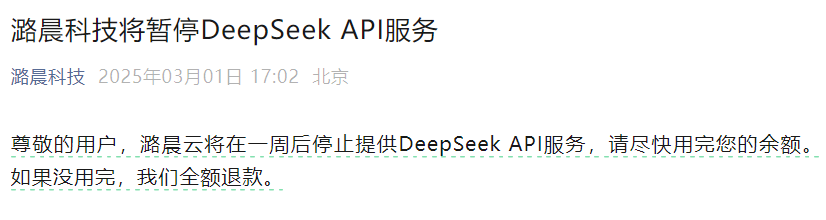 3月1日下午,潞晨科技宣布:“尊敬的用户,潞晨云将在一周后停止提供DeepSeek API服务,请尽快用完您的余额。如果没用完,我们全额退款。”此前,根据2月4日“华为计算”公众号,潞晨科技携手昇腾,联合发布基于昇腾算力的DeepSeek-R1系列推理API,及云镜像服务。