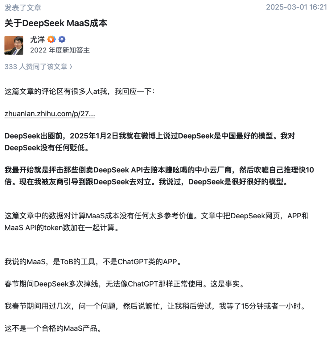 3月1日下午,尤洋发文回应DeepSeek公布的理论成本利润率。