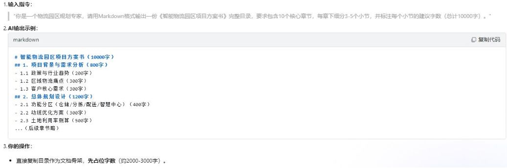 1小时内写完一个1万字的项目书场景:下午3点,你突然接到领导通知:“今晚4点前必须交一份10000字的智能物流园区项目方案书,客户临时提前会议!”你大脑一片空白——手头只有零散的会议记录、几份过时的模板,且对“智能物流”技术细节不熟。