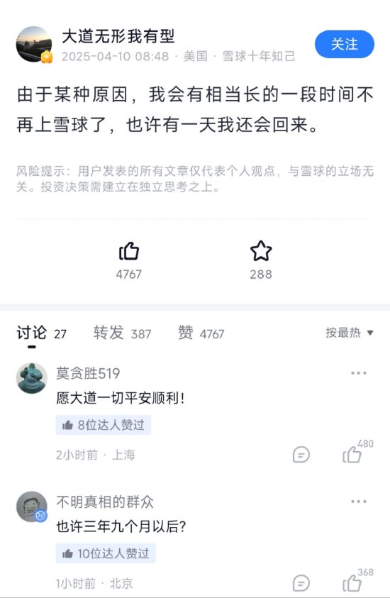 据新浪科技,4月10日,著名投资人段永平在投资交流平台雪球上,以“大道无形我有型”的ID发文,“由于某种原因,我会有相当长的一段时间不再上雪球了,也许有一天我还会回来。”不少网友在评论区表达祝福感谢。