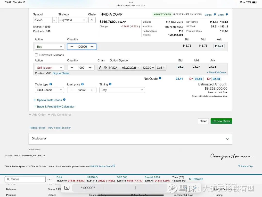 但是与之相对应的,因为他卖出看涨期权(CALL),就相当于和买家约定:如果到2026年3月20日,英伟达的股价涨过了120美金,买家可以要求他以120美金的价格出售英伟达。