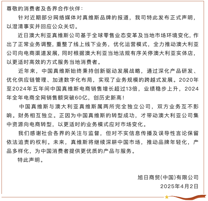 据界面新闻,4月8日,旭日商贸(中国)有限公司日前发布声明称,近日澳大利亚真维斯公司基于全球零售业态变革及当地市场环境变化,作出了正常业务调整,重整了线上线下业务,优化运营模式,全力推动澳大利亚公司向电商渠道发展,同时根据澳大利亚当地法规有序关停澳大利亚实体店,以更适时高效的方式服务当地消费者。声明称,中国真维斯与澳大利亚真维斯属两所完全独立公司,双方业务互不影响。财务相互独立。