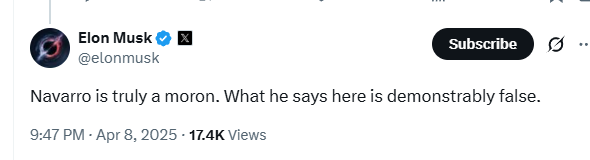 据华尔街见闻,马斯克回应白宫贸易顾问纳瓦罗称其为“汽车组装工”:他“真是个白痴”,他所说的显然是错误的。