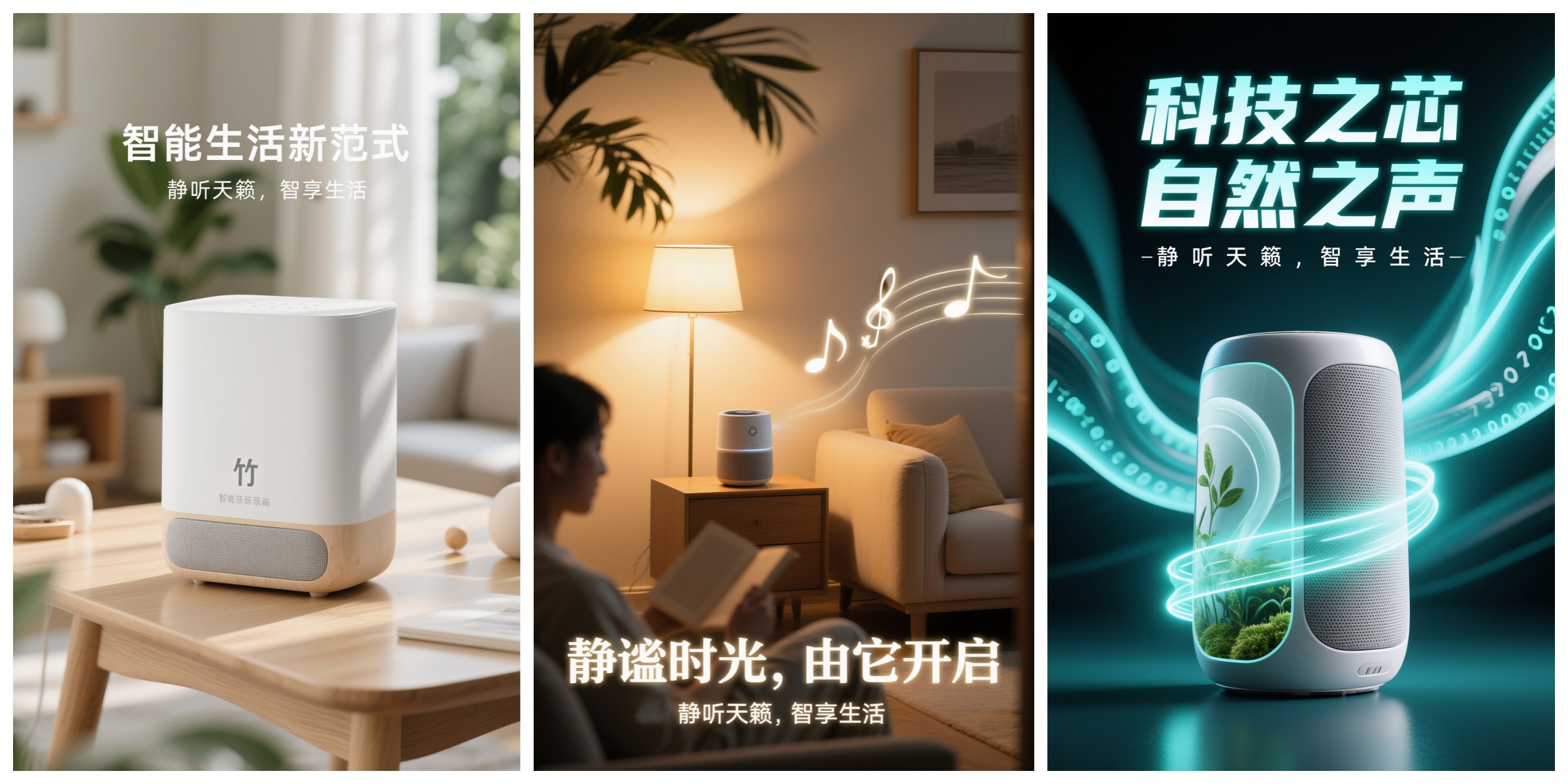 创意文字: "静听天籁,智享生活" (Listen to Nature, Live Smartly)