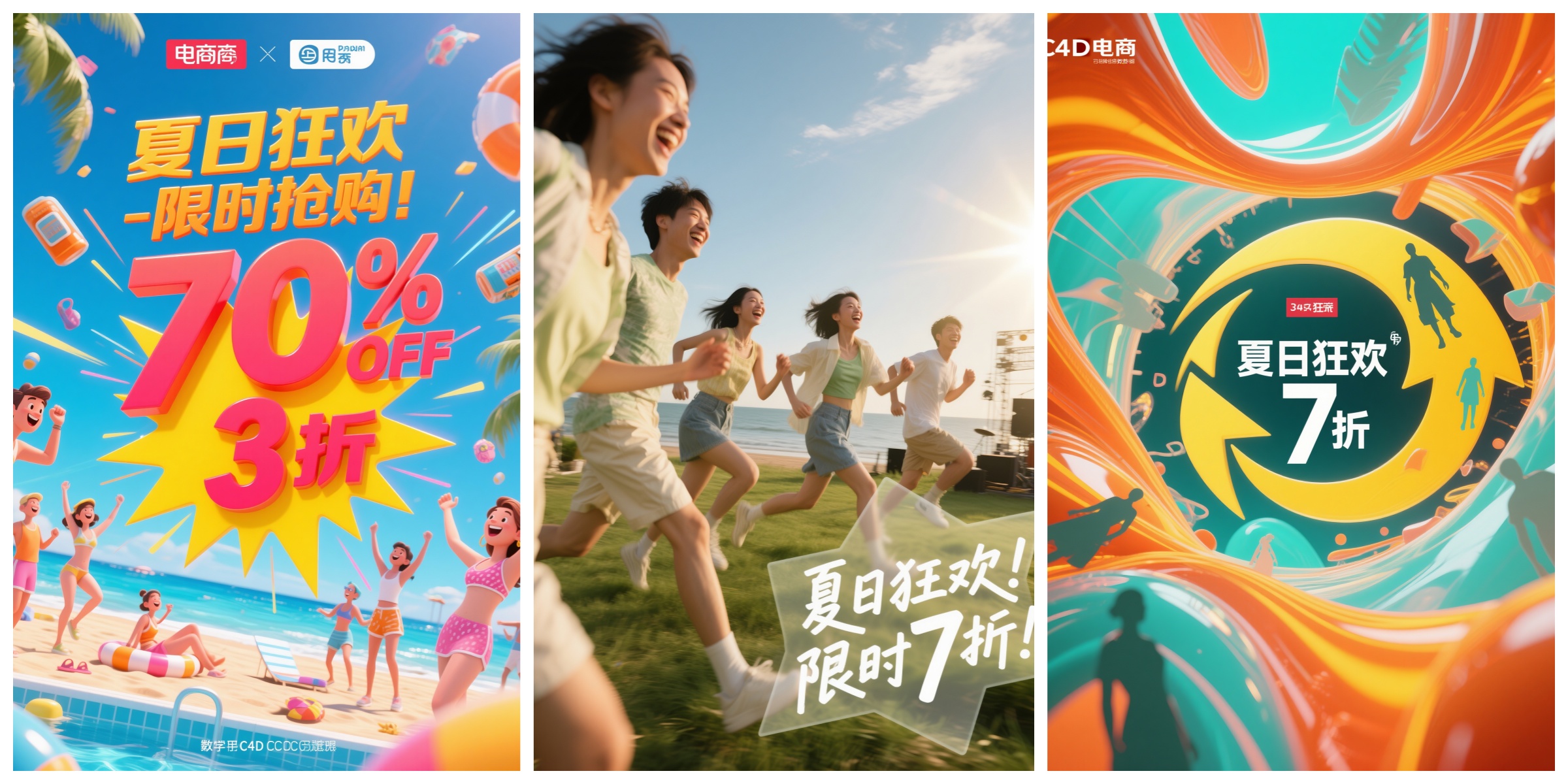 创意文字: "夏日狂欢,限时7折!" (Summer Frenzy, 30% Off Limited Time!)