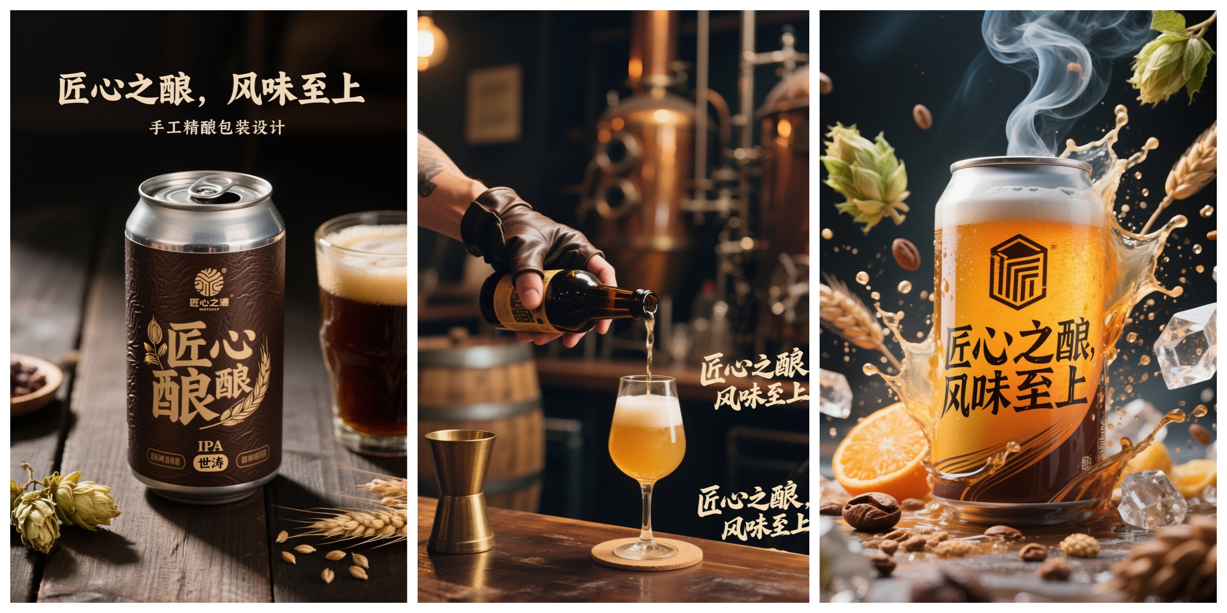 包装设计概念海报: 展示一款手工精酿啤酒的包装设计理念。