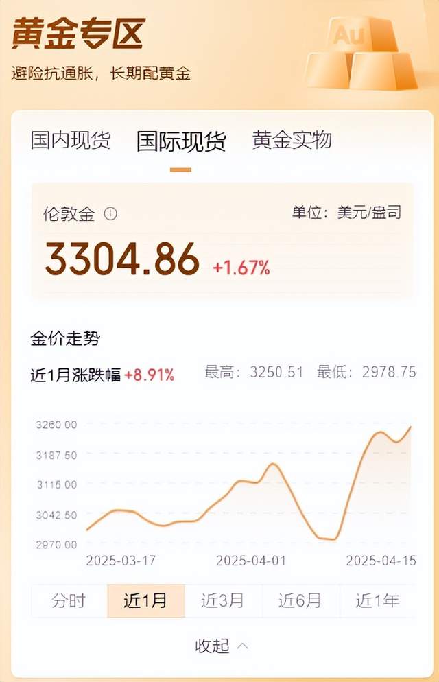 周三(4月16日)亚市早盘,现货黄金短线突然暴涨,金价突破3270美元/盎司,到16日16时,伦敦金突破3300美元/盎司大关,日内涨幅超过40美元。现货黄金价格刚刚触及3274.95美元/盎司,刷新纪录高位。