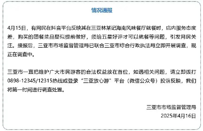 据中国新闻周刊,4月16日,三亚市市场监督管理局发布情况通报:4月15日,有网民在抖音平台反映其在三亚林某记海南风味餐厅就餐时,店内服务态度差,购买的团餐菜品疑似提前做好,须给五星好评才可以就餐等问题,引发网民关注。接报后,三亚市市场监督管理局已联合三亚市综合行政执法局立即开展调查,现正在调查中。