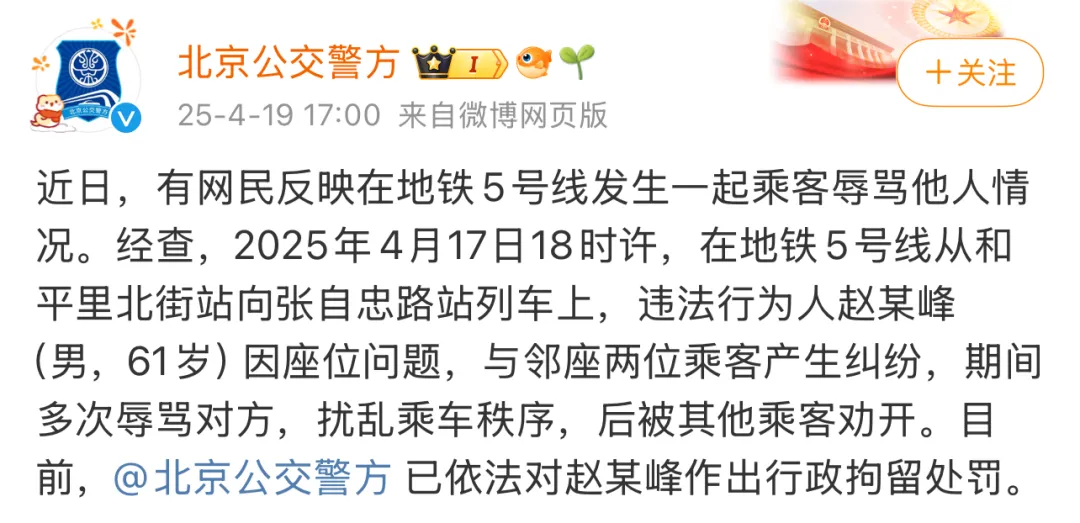 据封面新闻,4月19日,@北京公交警方 发布通报: