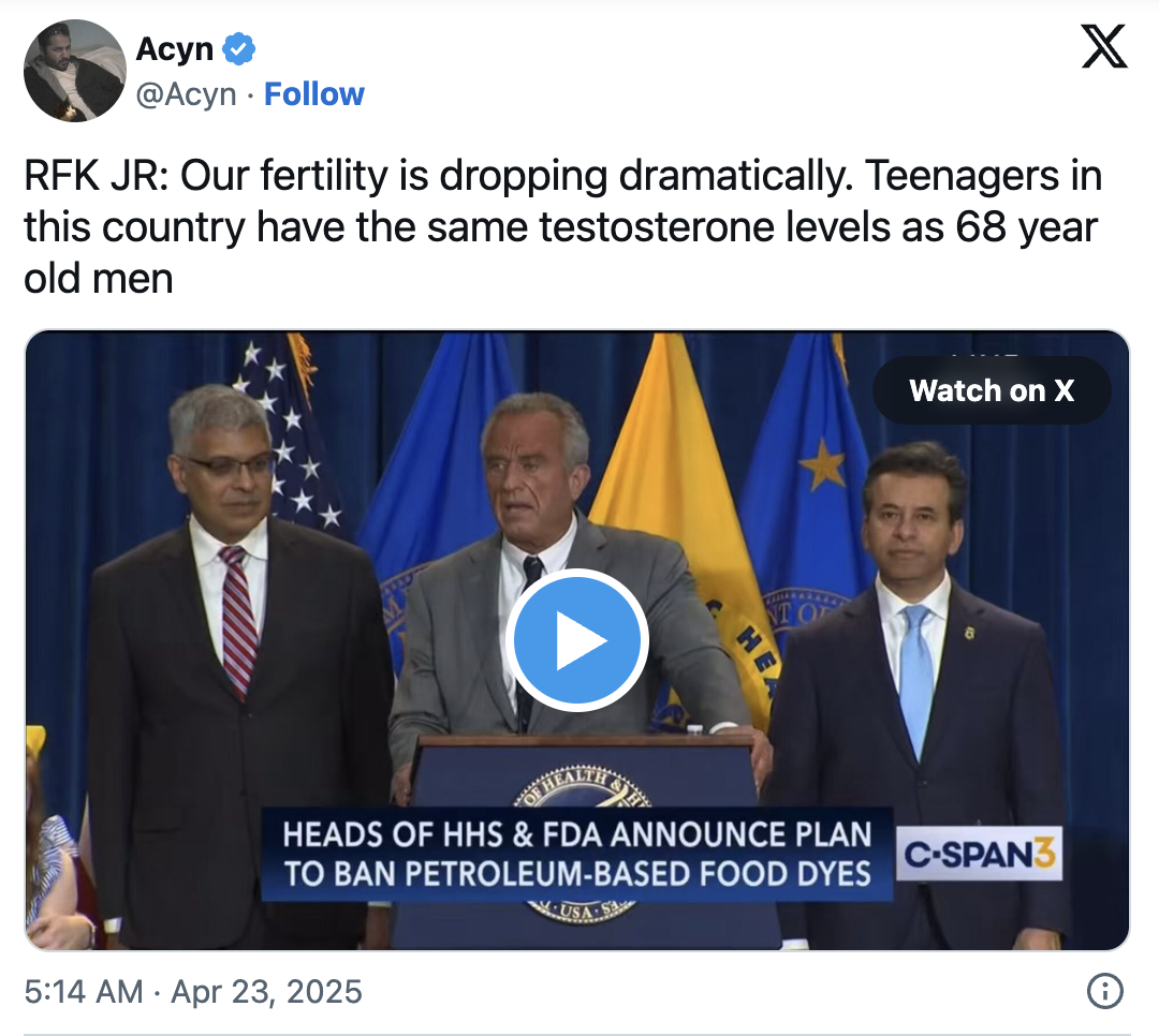 “我们的生育率正在急剧下降。整个国家的青少年睾酮水平和68岁的男性一样”,肯尼迪在新闻发布会上说道。