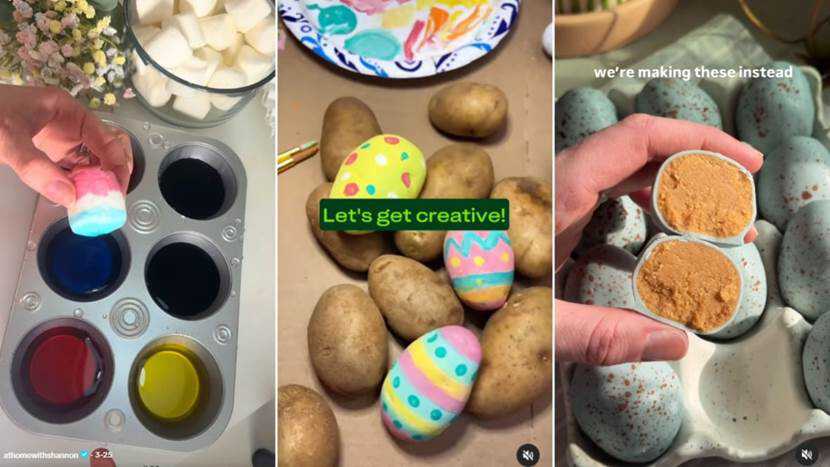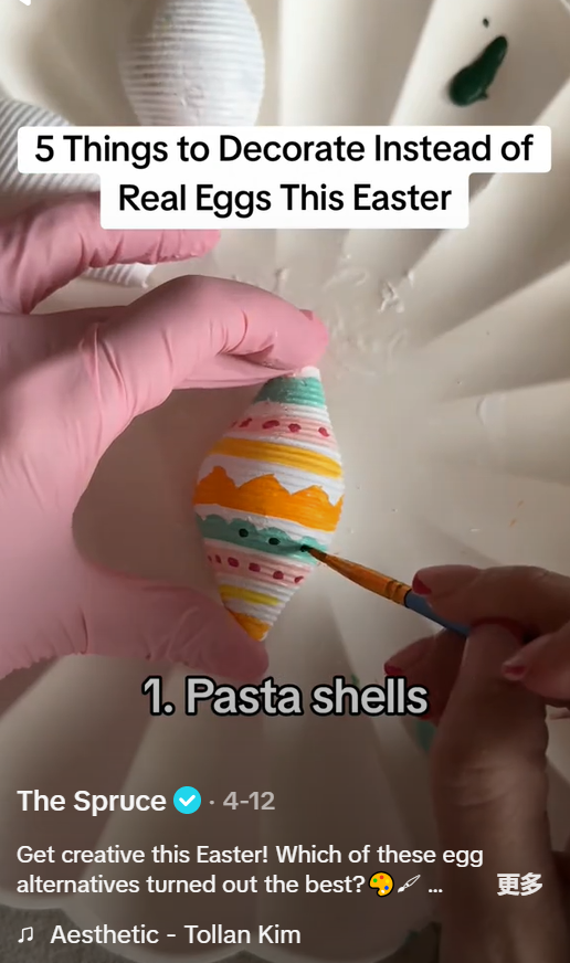 比如,生活方式和家居设计网站@The Spruce 就在TikTok 上发布了一个视频,其中提供了五种装饰真鸡蛋的方法,包括画贝壳状意大利面、土豆和粘土蛋等。