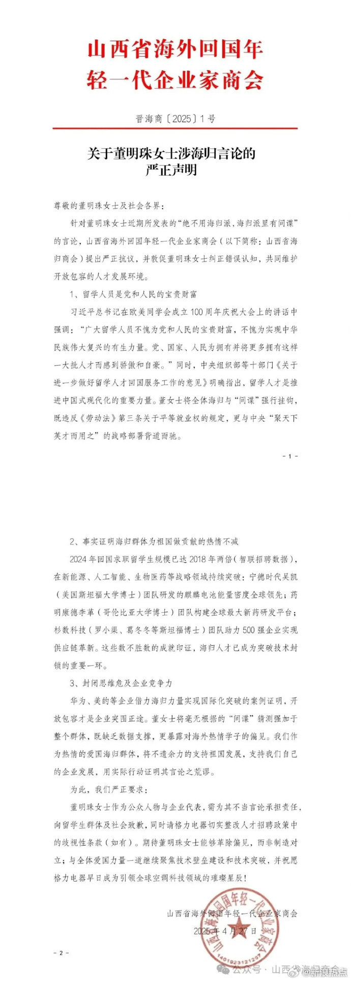 山西省海归商会严正要求:董明珠作为公众人物与企业代表,需为其不当言论承担责任,向留学生群体及社会致歉,同时请格力电器切实整改人才招聘政策中的歧视性条款(如有)。