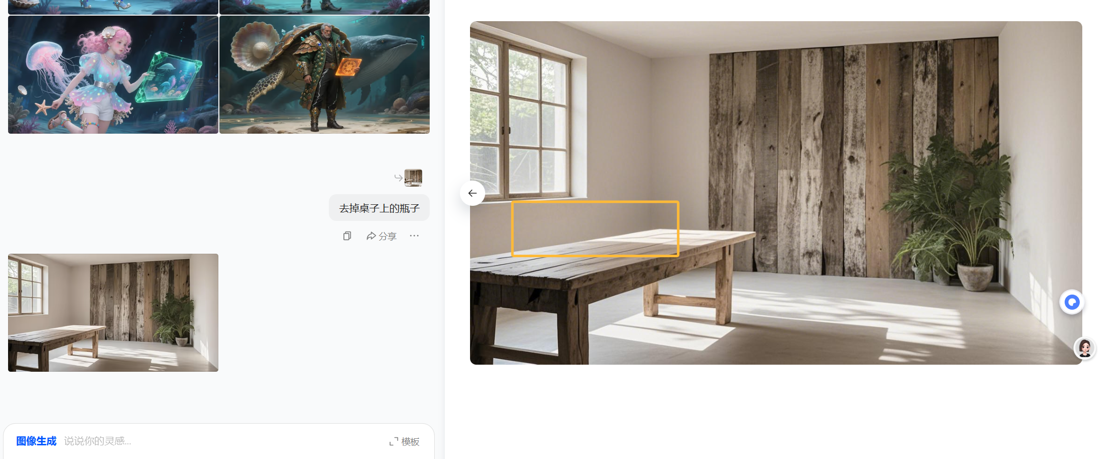 比如输入“请为我创作一张体现'侘寂 (Wabi-Sabi)'美学的室内设计效果图。要求:不直接展示破旧,而是通过光影、材质(如风化的木材、粗糙的陶器)、留白和不对称构图,传达出一种宁静、朴素、接受无常和不完美的氛围。色调要柔和、自然。”