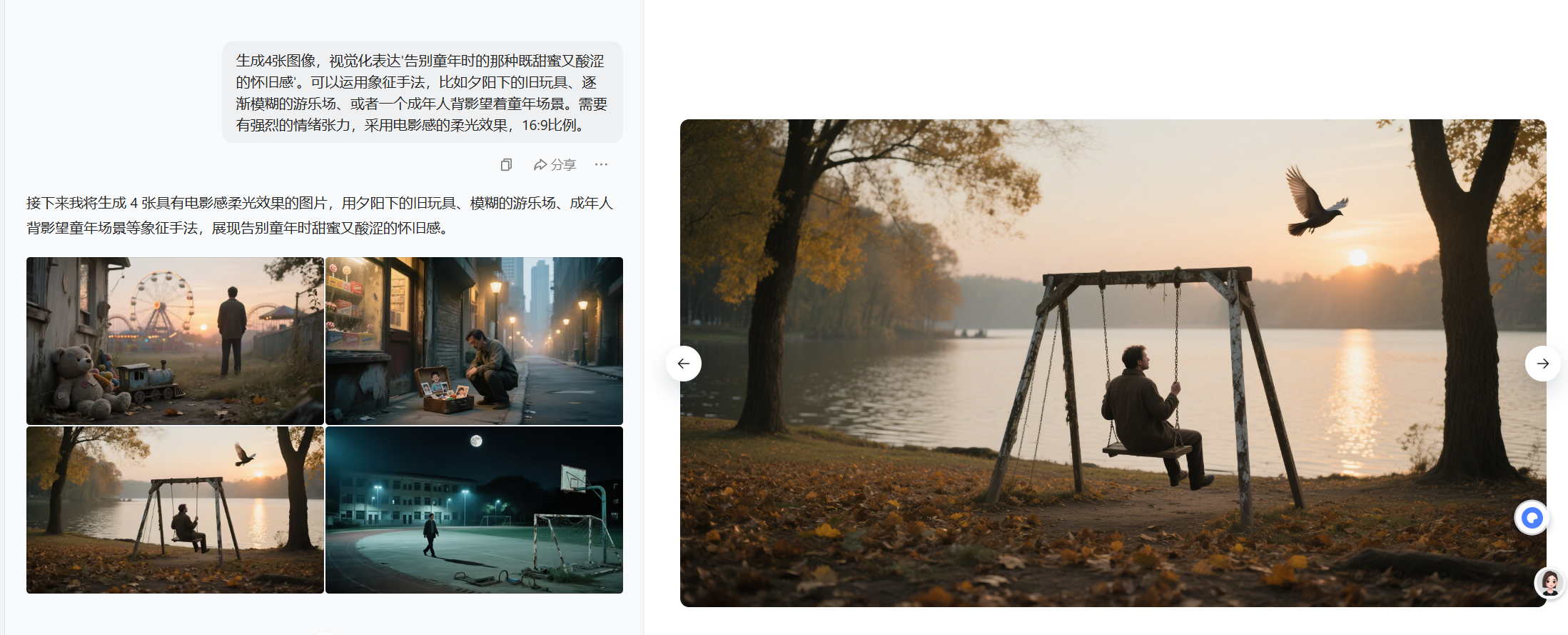 再来第二个情感提示词:“生成一张图像,视觉化表达'告别童年时的那种既甜蜜又酸涩的怀旧感'。可以运用象征手法,比如夕阳下的旧玩具、逐渐模糊的游乐场、或者一个成年人背影望着童年场景。需要有强烈的情绪张力,采用电影感的柔光效果,16:9比例。”