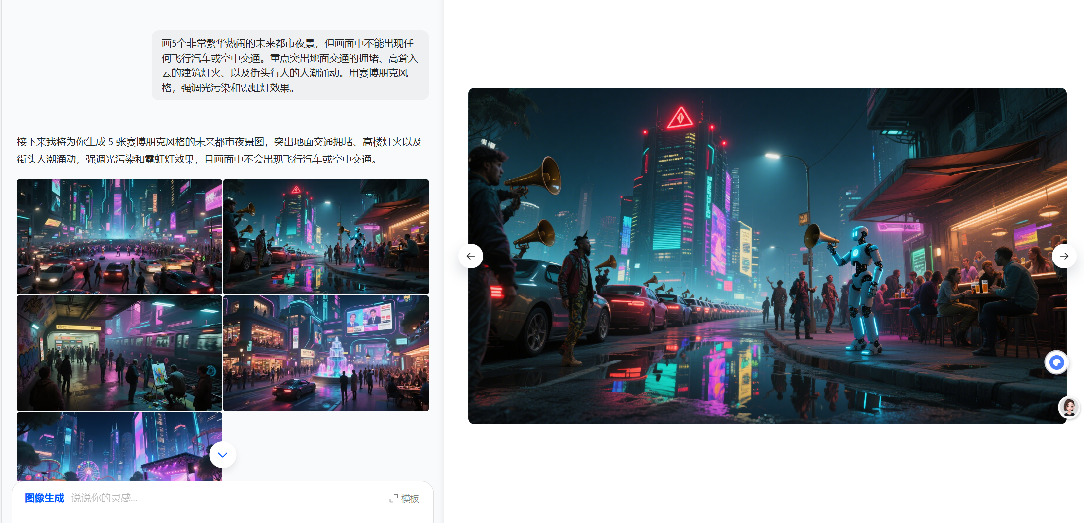 这次我试了下豆包,对于反向的提示词也是可以理解并控制在图像里的,比如输入:“画一个非常繁华热闹的未来都市夜景,但画面中不能出现任何飞行汽车或空中交通。重点突出地面交通的拥堵、高耸入云的建筑灯火、以及街头行人的人潮涌动。用赛博朋克风格,强调光污染和霓虹灯效果。”