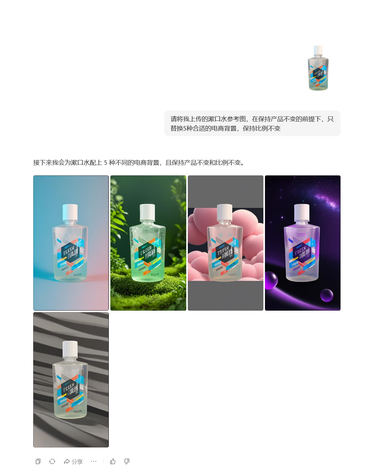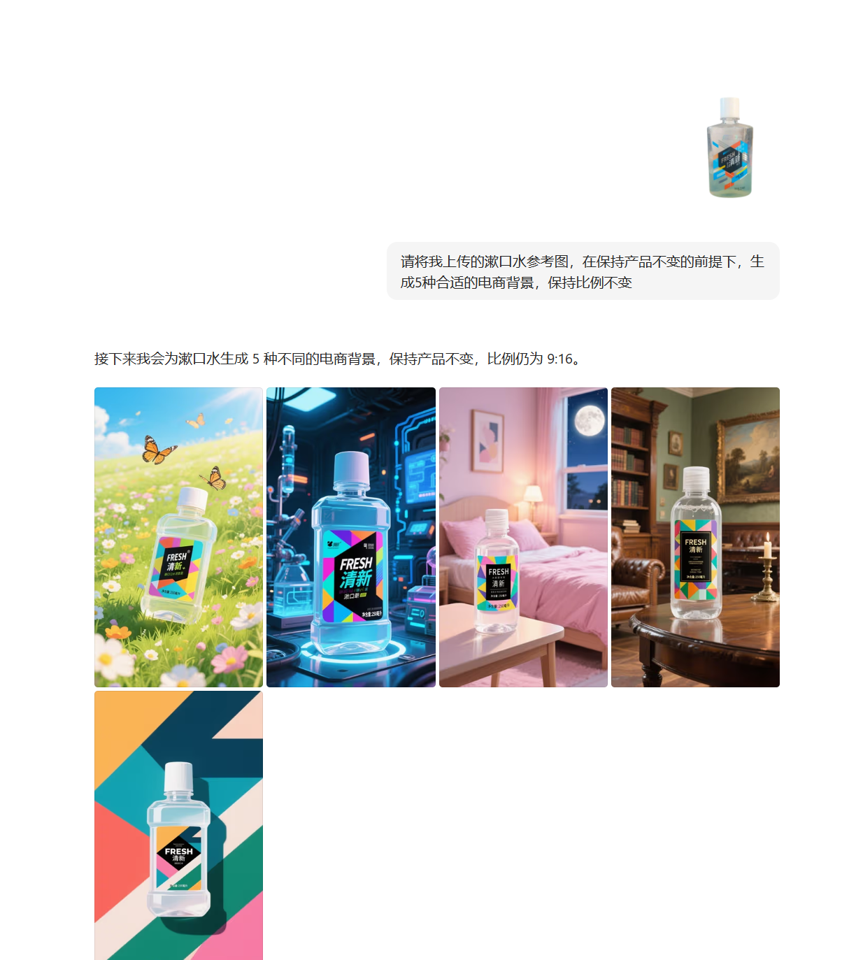 “请将我上传的漱口水参考图,在保持产品不变的前提下,只替换5种合适的电商背景,保持比例不变”。