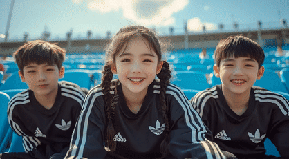 “中景镜头:三个东亚儿童(两个男孩,中间一个梳着辫子的女孩)穿着同款黑色运动服,坐在明亮蓝色体育场看台座椅上,头顶是晴朗天空。起初,他们带着一丝紧张的期待望向前方。突然,他们左侧的画面外发生了令人兴奋的事情:左边的男孩惊讶地张开嘴指向那个方向,身体前倾显得很急切;中间的女孩脸上绽放出灿烂喜悦的笑容,并拍起手来;右边的男孩兴奋地在座位上轻轻跳了一下,笑着顽皮地用胳膊肘碰了碰女孩。保持镜头稳定在中景,捕捉他们表情的细微变化和互动。轻微的镜头晃动,模拟手持拍摄的兴奋感。”