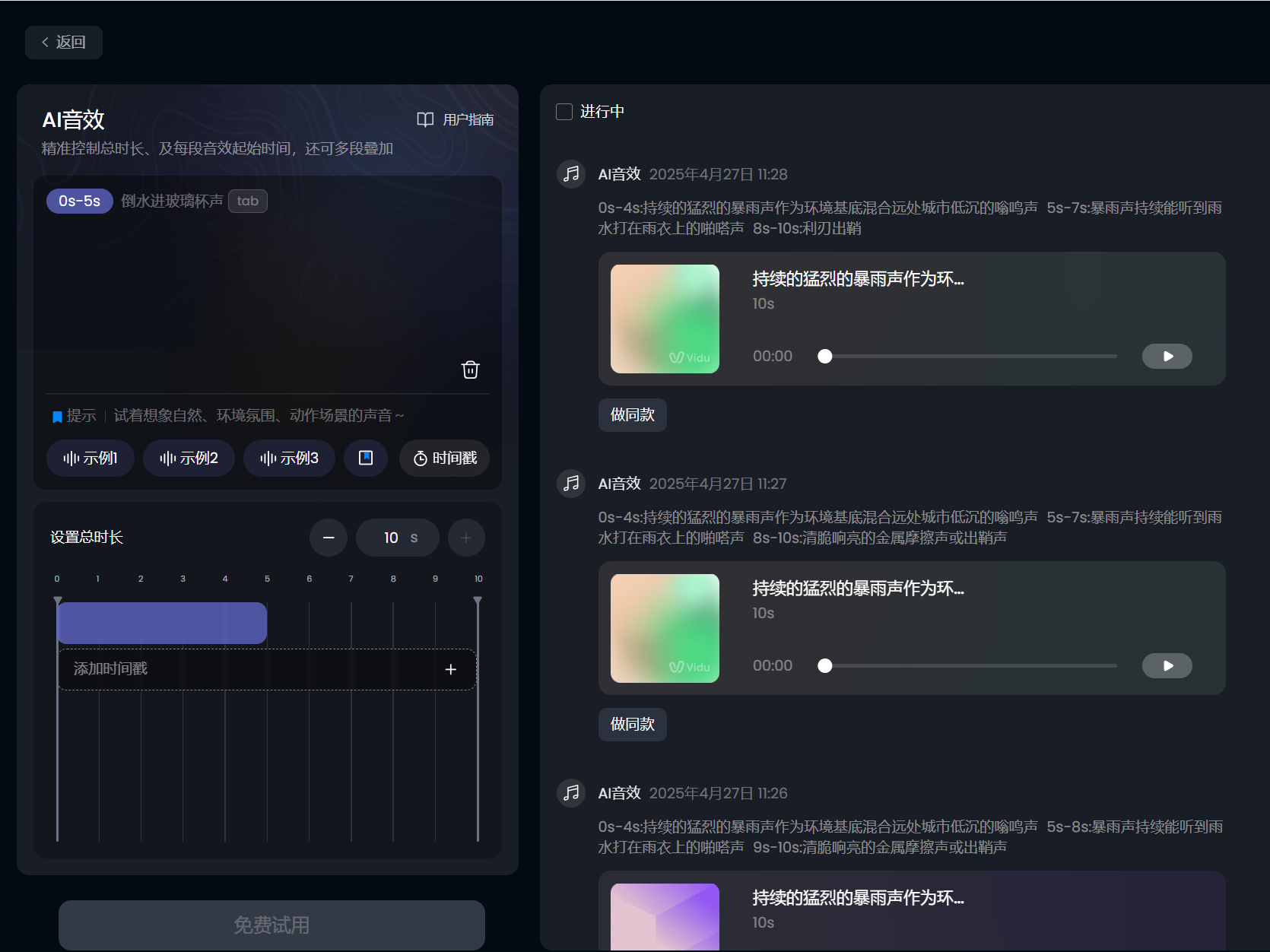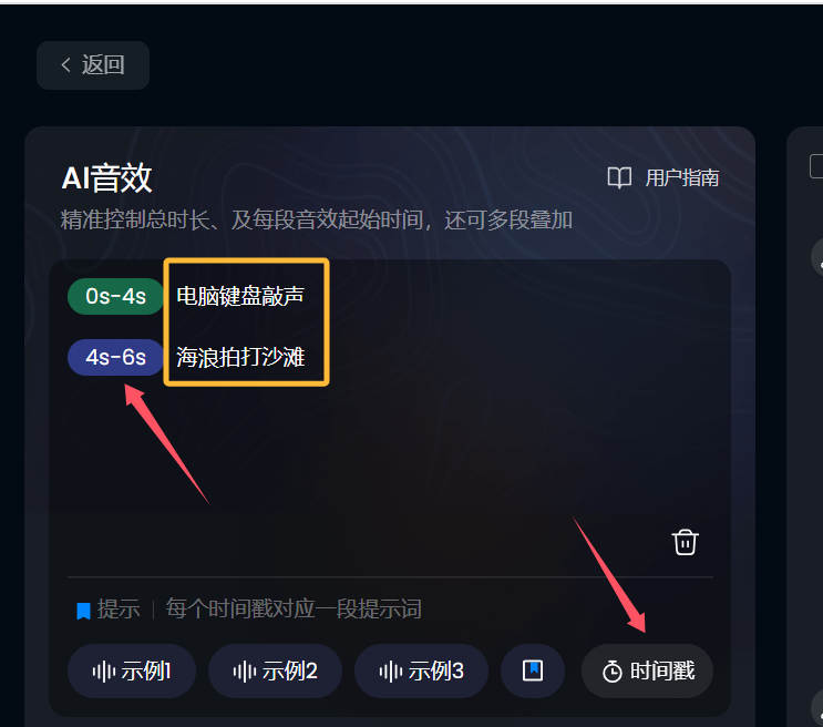 主页左侧点击音效生成,会看到专门ai音效生成的板块,如果不会写,可以点击示例看看。一个时间戳+一段文字描述即可。