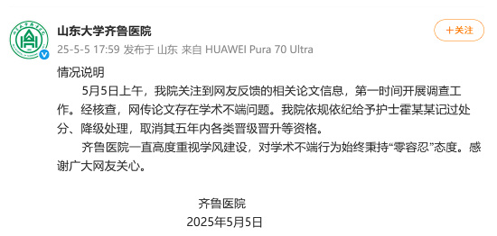 据北京青年报,5月5日上午,我院关注到网友反馈的相关论文信息,第一时间开展调查工作。经核查,网传论文存在学术不端问题。我院依规依纪给予护士霍某某记过处分、降级处理,取消其五年内各类晋级晋升等资格。齐鲁医院一直高度重视学风建设,对学术不端行为始终秉持“零容忍”态度。感谢广大网友关心。
