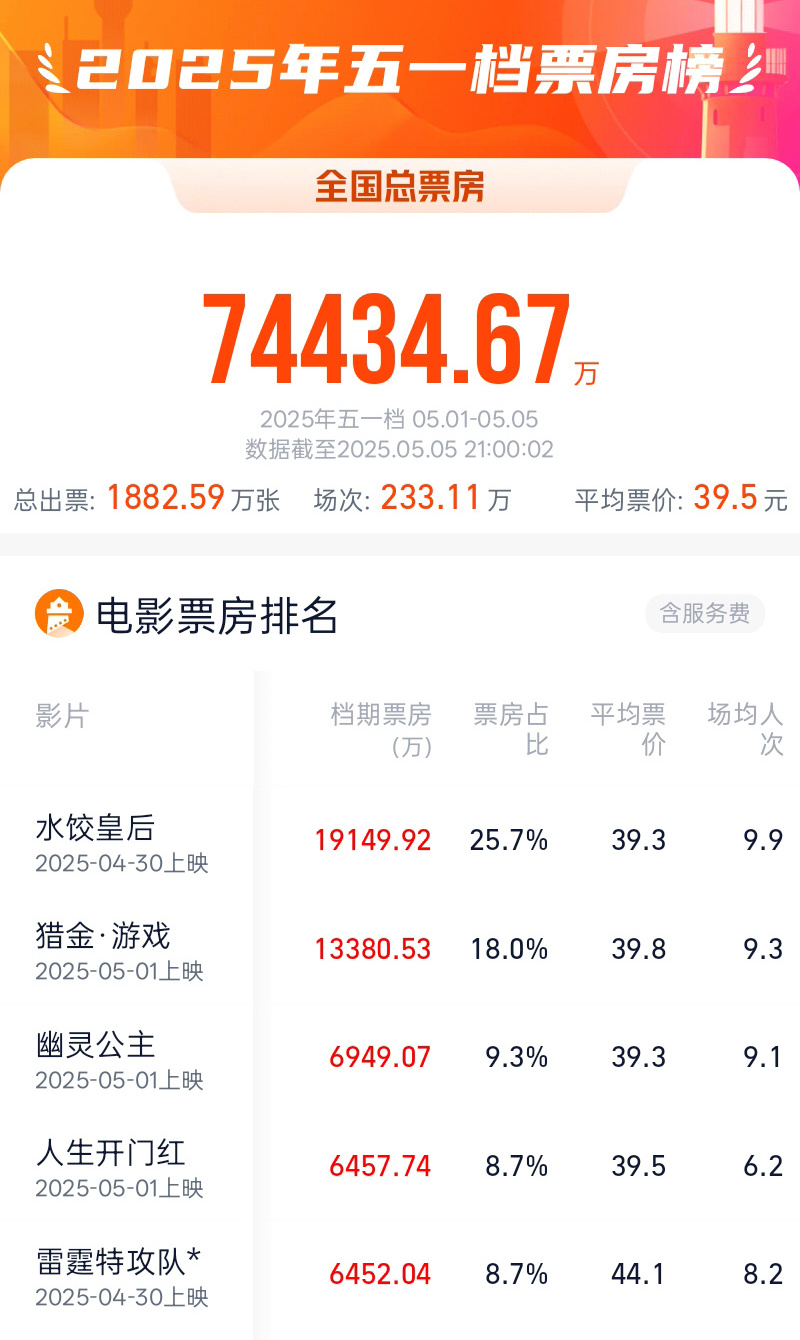 据央视新闻,根据网络平台数据,截至5月5日21时,2025年五一档(5月1日—5月5日)票房7.44亿。影片《水饺皇后》《猎金·游戏》《幽灵公主》暂列前三名。