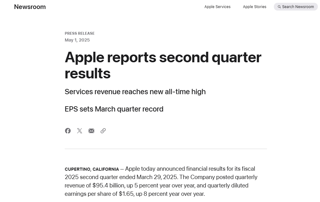 具体来看,在截至2025年3月29日的第二财季,苹果公司总营收为953.6亿美元,市场预期为943亿美元,去年同期为907.53亿美元;净利润为247.8亿美元,市场预期为242.6亿美元,去年同期为236.36亿美元;每股收益为1.65美元,高于1.62美元的预期,去年同期为1.53美元。