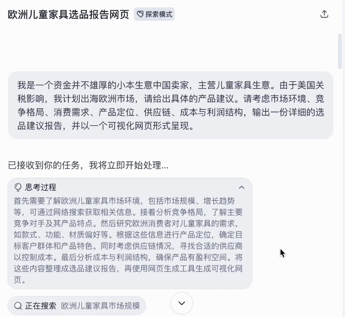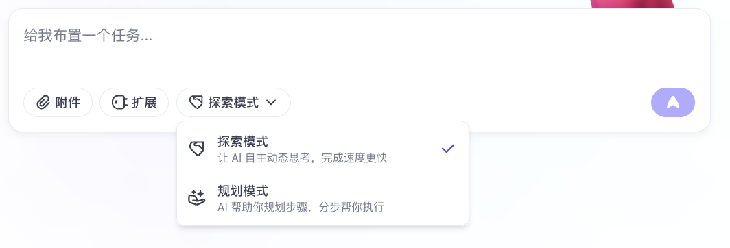 有两种模式可选,探索模式和规划模式。探索模式是AI自主动态思考、完成速度更快;规划模式则是AI帮助你规划步骤,分步帮你执行,适合高复杂性和需要深度思考的任务。这次我选择了探索模式。