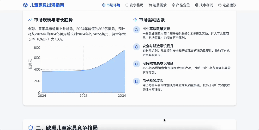 我是一个资金并不雄厚的小本生意中国卖家,主营儿童家具生意。由于美国关税影响,我计划出海欧洲市场,请给出具体的产品建议,请考虑市场环境、竞争格局、消费需求、产品定位、供应链、成本与利润结构,给出一份详细的选品建议报告。并以一个可视化的网页呈现。