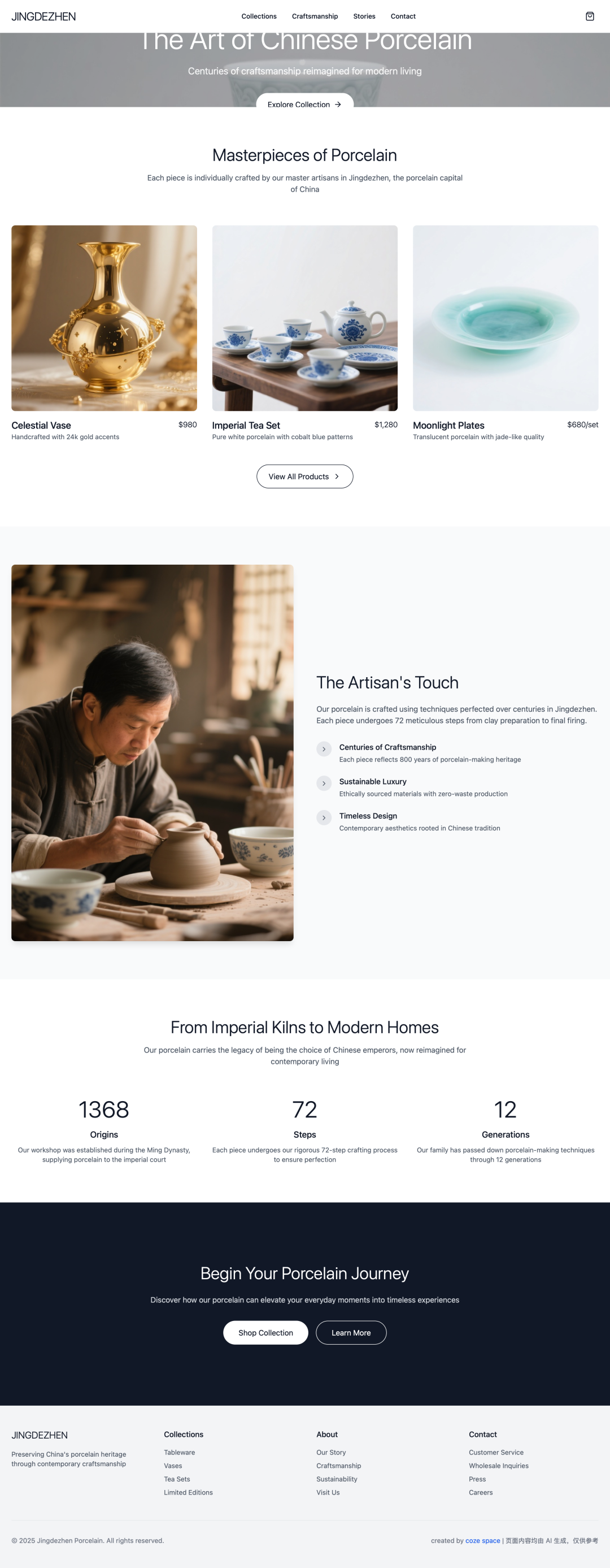 请参考苹果官方网站首页(https://www.apple.com/)的设计风格与内容逻辑,为一家中国高端瓷器品牌设计一个面向海外消费者的英文独立站首页。要求: