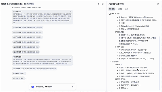 扣子根据产品特性、用户角色、使用场景进行了全网相关资料搜搜索,随后基于用户旅程的六大阶段,逐步填充出真实且具有同理心的路径表单内容,并将其结构化为一张网页可视的Journey Map图表,结构清晰,心理层洞察有一定深度,尤其输出图表美观、有逻辑感,已经很适合做品牌汇报或作为营销策略前置材料了。