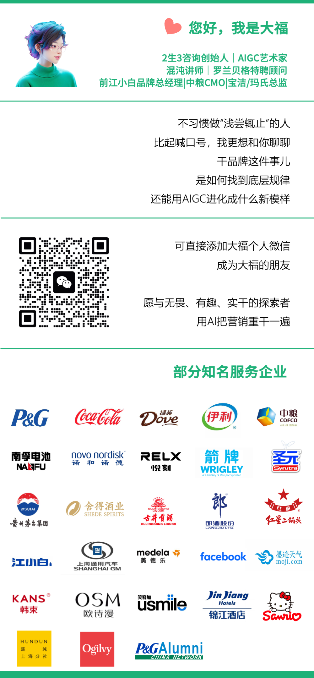 谢谢你看我的文章,期待你随手点赞、在看、转发三连!也期待你的关注,大福将持续更新自己在品牌营销领域的AI思考和实践,超干货!