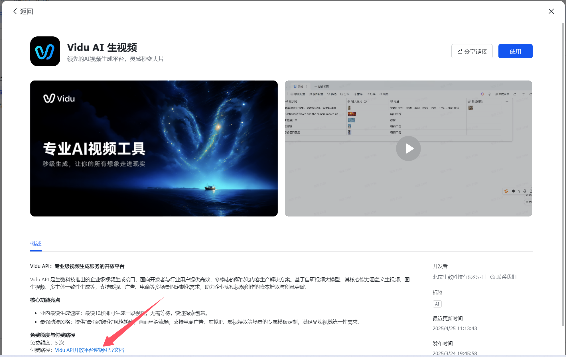 提示词也有了,接下来就是第三列,接入搜索找到vidu的字段捷径,官方也介绍了详细的如何获取密钥的过程,就不再赘述了。