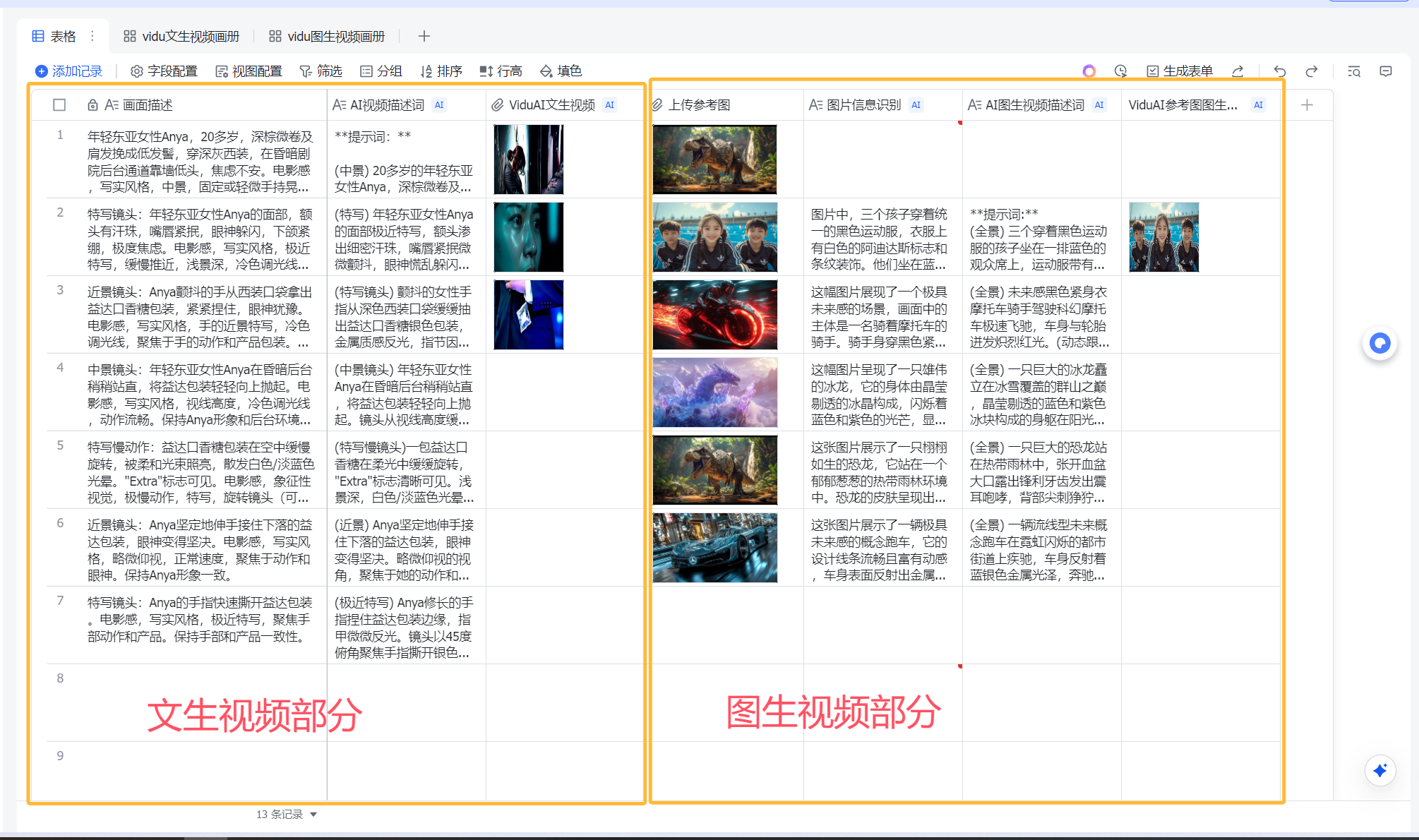 于是我很快搭建了一份多维表格,实现了两种大的功能,一个是根据画面描述批量生成视频(文生视频),一个是参考图+提示词批量生成视频(图生视频),模版放在结尾可以自行获取。